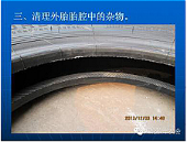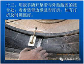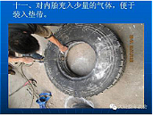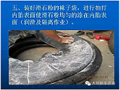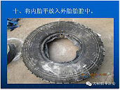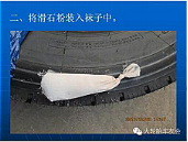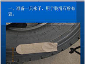 ??1、準(zhǔn)備一只襪子,用于滑石粉???2、將滑石粉裝入襪子中。?3、清理外胎胎腔中的雜物。??4、確認(rèn)內(nèi)胎墊片與螺母是否擰緊。5、裝好滑石粉的襪子袋,進(jìn)行拍打內(nèi)胎表面使滑石粉均勻的涂抹在內(nèi)胎表面(潤(rùn)滑及隔離作業(yè))。??6、將涂抹滑石粉的內(nèi)胎拿起來(lái)抖動(dòng),將多余的滑石粉抖掉出(防止滑石粉結(jié)塊)。?7、將裝好滑石粉的襪子袋,進(jìn)行拍打外胎胎腔使滑石粉均勻涂抹胎腔中。??8、裝好滑石粉的襪子袋,進(jìn)行拍打墊帶表面,使滑石粉均勻涂在墊帶表面。?9將涂抹滑石粉的墊帶拿起來(lái)抖動(dòng)將多余的滑石粉抖掉出。??10、將內(nèi)胎平放到外胎胎腔中11、將內(nèi)胎沖入少量氣體以便裝入墊帶。?12、裝配好墊帶使內(nèi)胎氣嘴銅座與墊帶墊片中心孔吻合。13、用扳手撬開墊帶與外胎胎腔的接合處,看看墊帶邊緣是否打折,若有打折隨時(shí)調(diào)整好。