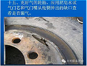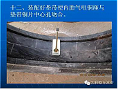 ?14、將外胎與鋼圈組合好,再次對(duì)內(nèi)胎的氣門嘴桿調(diào)整至鋼圈氣嘴槽中心位置。15、充氣好的輪胎,用肥皂水試氣門芯和氣門嘴從輪輞伸出的缺口查看是否漏氣。?16、將內(nèi)胎氣門嘴保護(hù)帽安裝好,再次確認(rèn)各組組件全部安裝好。